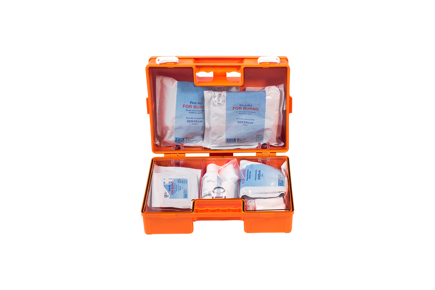 Large, well-filled burn aid box that contains several different sizes of AKLA's FOR BURNS range to fit the most common burns.