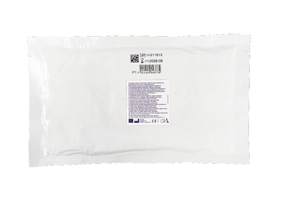 Det finns alltid extra gel kvar i påsen som bör hällas över kompressen där de öppna cellerna snabbt transporterar den vidare ner till skadan. Kompressen kan fixeras löst med gasbinda.
