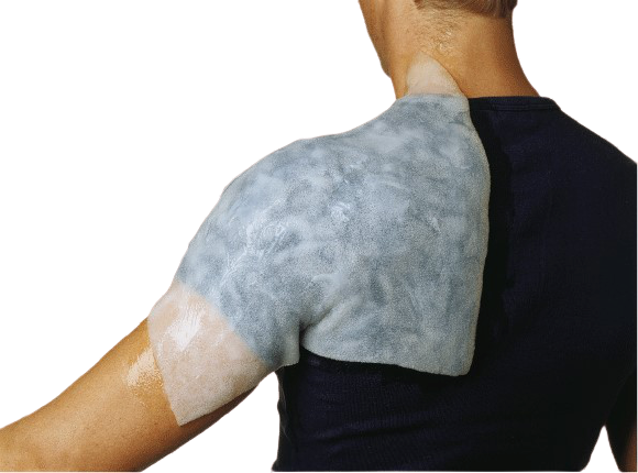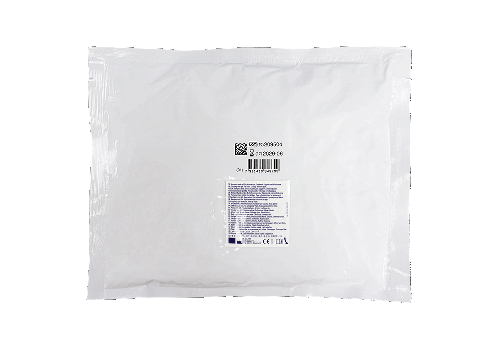 Det finns alltid extra gel kvar i påsen som bör hällas över kompressen där de öppna cellerna snabbt transporterar den vidare ner till skadan. Kompressen kan fixeras löst med gasbinda.