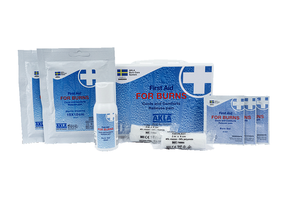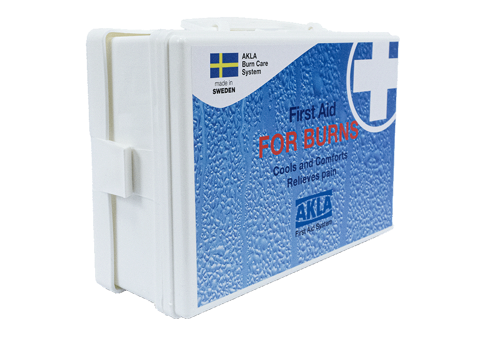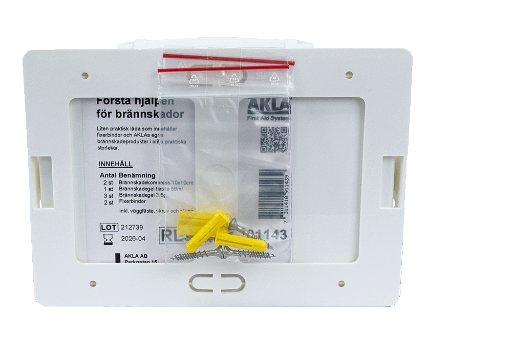 Liten låda som innehåller brännskadekompresser i olika storlekar. Lådan är lätt att ta med sig till den skadade.