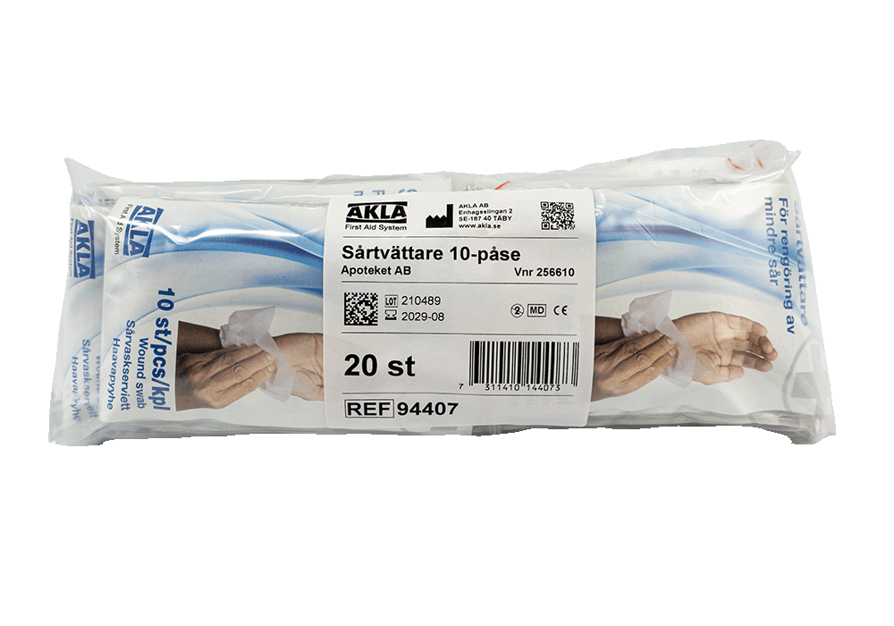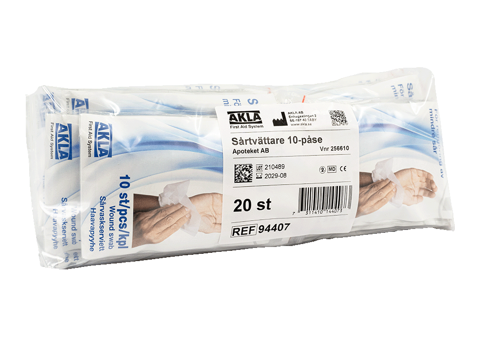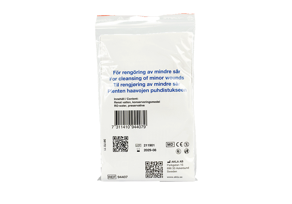 AKLAs enstycksförpackade sårtvättare avsedda för rengöring av mindre sår och insektsstick då det inte finns tillgång till tvål och vatten.