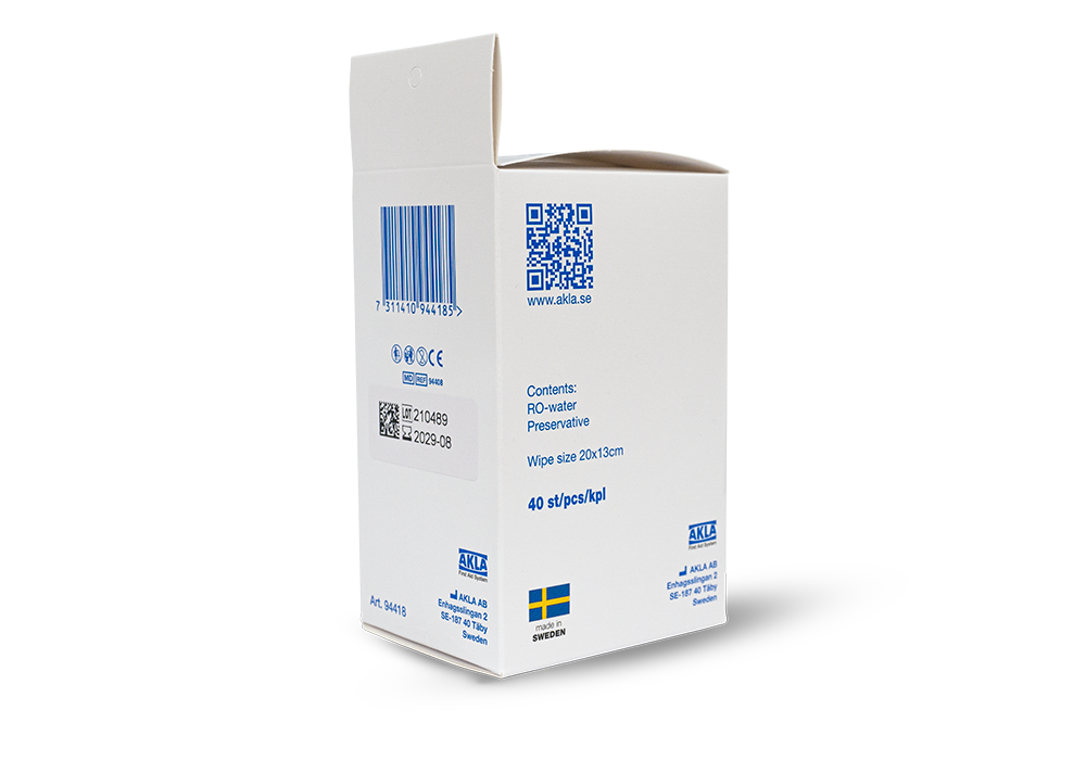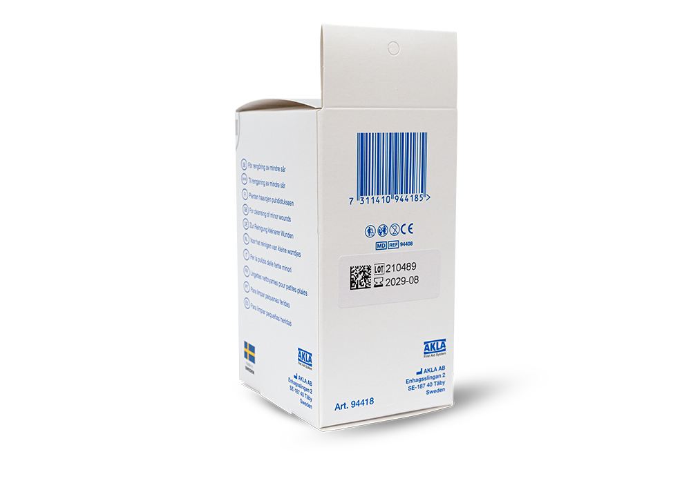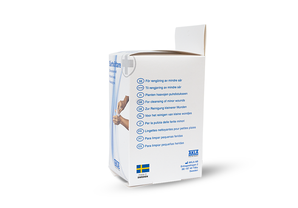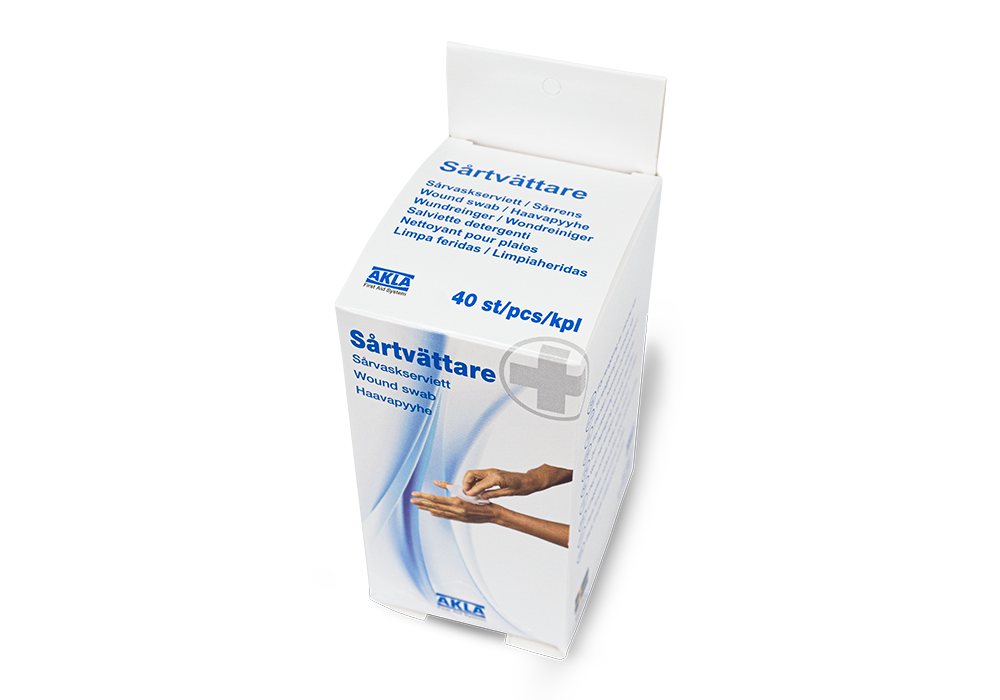 AKLAs enstycksförpackade sårtvättare avsedda för rengöring av mindre sår och insektsstick då det inte finns tillgång till tvål och vatten.